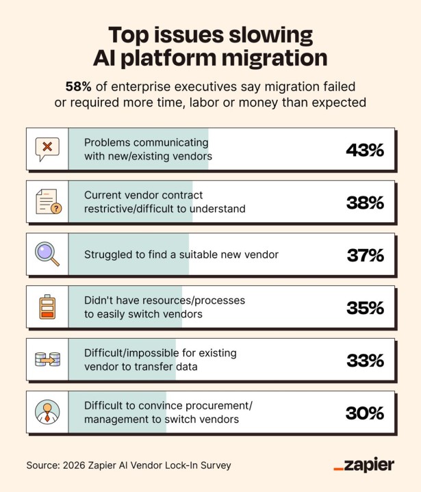 La realtà è completamente diversa. Il 66% del campione di Zapier ha già provato a fare lo "switch" tra piattaforme di AI e, di questo gruppo di aziende, solo il 42% - quindi, fatti conti, solo il 28% scarso del campione - ha vissuto una transizione indolore. Il resto afferma che il processo ha richiesto un sforzo significativamente maggiore del previsto, oppure è fallito del tutto.