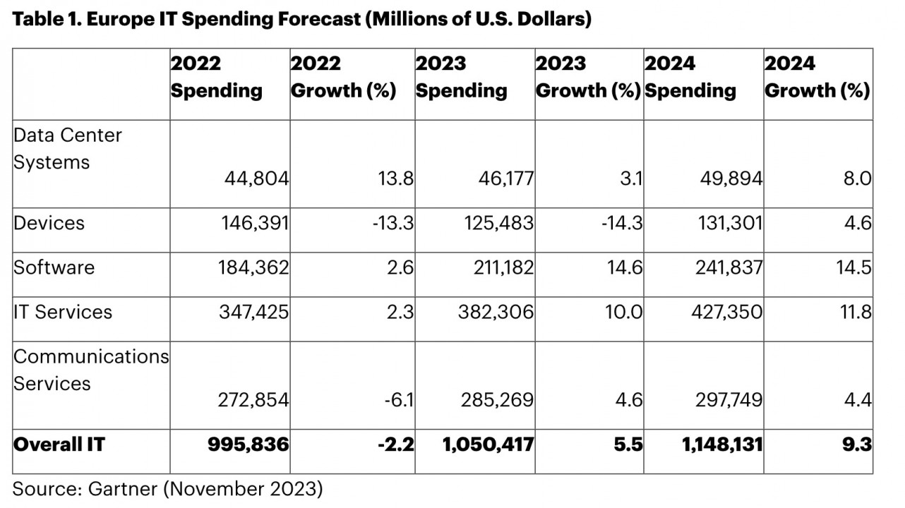 Il software e i servizi IT sono i due comparti in cui si prevede che le aziende europee aumenteranno maggiormente la loro spesa nel 2024. Una parte della crescita dei servizi IT è dovuta alla carenza di personale e skill nei reparti IT. La risposta a questo problema è infatti spesso la cessione all'esterno, a service provider e fornitori tecnologici, dei compiti che il personale interno non riesce a svolgere.