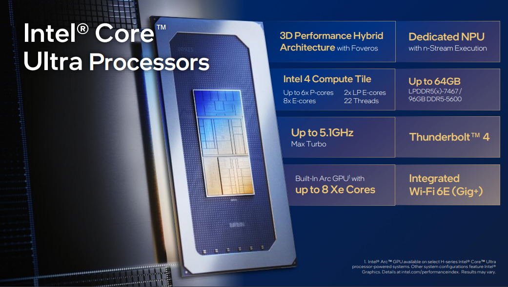 Non solo: Intel Core Ultra offre una GPU Arc integrata con un massimo di otto core Xe, Xe Super Sampling (XeSS) basato su AI, supporto DX12 Ultimate e fino al doppio delle prestazioni grafiche rispetto alla generazione precedente. La GPU include il supporto per funzionalità grafiche avanzate tra cui ray tracing con accelerazione hardware, mesh shading, codifica e decodifica AV1, HDMI 2.1 e DisplayPort 2.1 20G.