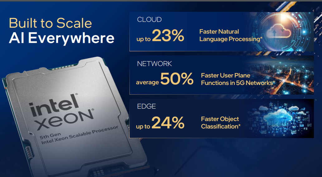 La famiglia di processori Intel Xeon di quinta generazione, anch'essa presentata ufficialmente all’evento “AI Everywhere”, rappresenta un significativo balzo in avanti in termini di prestazioni ed efficienza: un aumento medio delle prestazioni del 21% con la stessa potenza termica consente un aumento del 36% delle prestazioni per Watt. Gli utenti che seguono un tipico ciclo di aggiornamento di cinque anni e l'aggiornamento da generazioni ancora più vecchie potranno ridurre il proprio TCO fino al 77%.