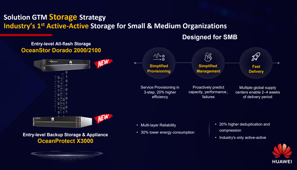 Oltre all’area wireless, è stato presentato anche il primo sistema di storage active-active del settore dedicato alle piccole e medie imprese, composto da OceanStor Dorado 2000/2100 e OceanProtect X3000, storage e appliance di backup di livello base. Trab le caratteristiche dei nuovi dispositvi, si segnalano in particolare il provinsioning semplificato, che incrementa del 20% l'efficienza; la gestione semplificata da numerose funzionalità proattive; e infine la possibilità di godere di consegne rapide nell'ordine delle 2-4 settimane, grazie a una rete globale di centri di fornitura.