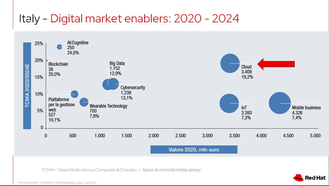 Come risulta da molte analisi di mercato l’hybrid cloud è la scelta di riferimento del mercato. Spiega Galli, se alle origini Red Hat si è focalizzata sulla costruzione del sistema operativo, Red Hat Enterprise Linux, nel tempo ha sviluppato intorno ad esso una serie di tecnologie che lo rendono stabile, sicuro e utilizzabile a livello aziendale.Un paradigma replicato quando, con il passare del tempo, la virtualizzazione ha cominciato a essere una commodity e si iniziava a lavorare su nuove tecnologie; da qui la scelta dei container, con Kubernetes come orchestratore di riferimento.