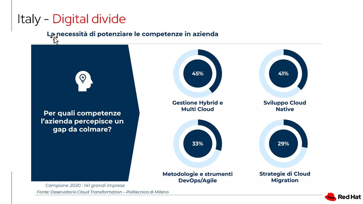 E per colmare il gap tra l’innovazione tecnologica continua e le competenze mancanti Red Hat mette in campo la componente di servizi professionali e training con l'obiettivo di definire percorsi e traiettorie lineari e semplificate, potendo contare anche sul supporto dell’ecosistema dei partner.