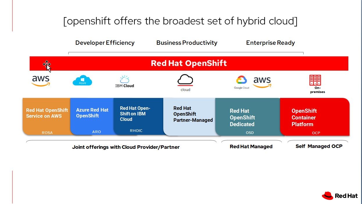 La piattaforma può essere utilizzata non solo in modalità on premise self managed, ma anche ‘managed’ dai diversi hyperscaler (AWS, Azure, IBM, Google Cloud…) o da altri partner che forniscono un servizio cloud su Red Hat OpenShift.