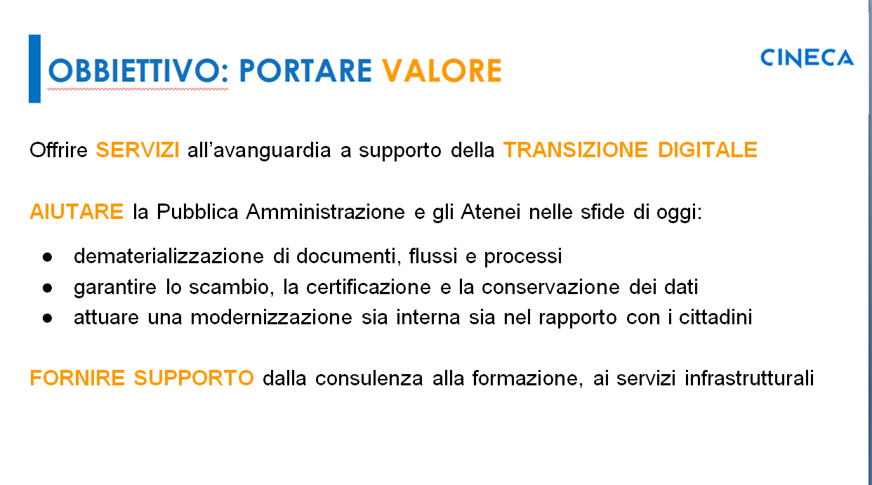 Le principali attività del Consorzio sono relative da una parte al Supercalcolo (lo scorso novembre è stato rilasciato il quarto supercomputer più grande al mondo nella classifica dei top 500 supercalcolatori più potenti al mondo, grande motivo di orgoglio per Cineca ma anche per l’Italia). In questo contesto Cineca supporta la ricerca italiana mettendo a disposizione questa enorme potenza di calcolo. Inoltre, Cineca supporta il Mur e tutti gli atenei nello sviluppo di soluzioni applicative software al fine di modernizzare gli aspetti applicativi del Ministero e delle Università.