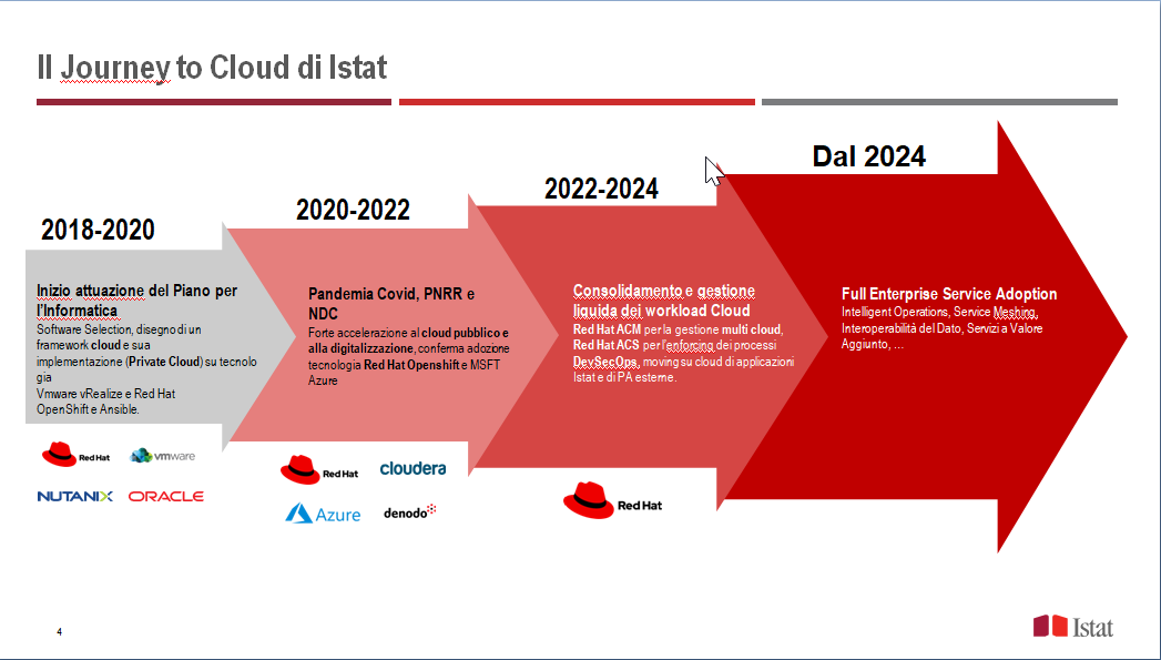 “ISTAT come ente innovativo di ricerca che basa il suo ‘core’ e la sua ‘mission’ sulla produzione statistica riconosce nella tecnologia un importante fattore abilitante. Tra i vari piani attuativi, nel 2018 l’Istituto ha avviato il Piano Triennale dell’IT, un cammino di trasformazione tecnologica che punta lontano e si pone molteplici sfide, con obiettivi sfidanti, tra cui quello di dotarsi di un proprio private cloud per predisporre un framework tecnologico per erogare servizi in modalità cloud native – Iaas e Paas – basati anche su tecnologie Red Hat. “Un obiettivo che ci rende protagonisti dal punto di vista di riduzione del time to market, di standardizzazione degli ambienti e di una gestione dei processi calibrata sul paradigma cloud, on prem e hybrid”, spiega Magarò.