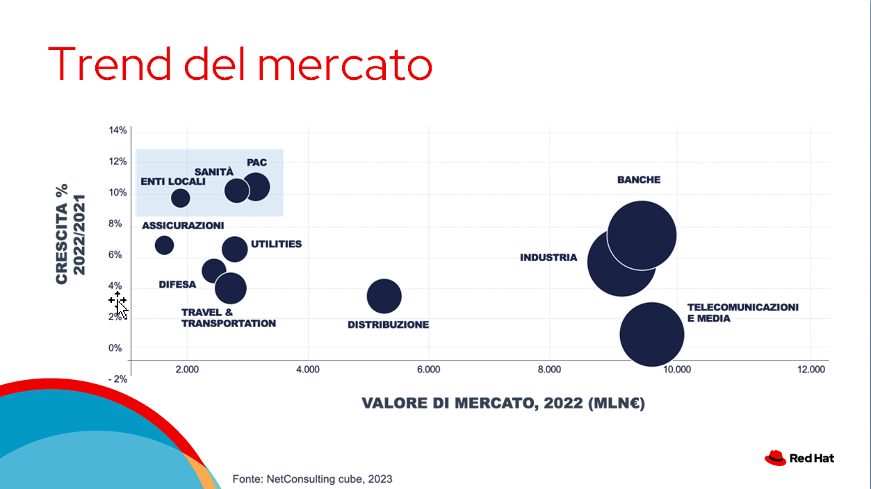 E prosegue: “Oggi si avverte una forte spinta al cambiamento e a investire in questa direzione, sia nel mondo privato che in quello pubbblico. A trainare la trasformazione è ancora una volta il settore privato, con il comparto bancario che la fa da padrone, con una Pubblica Amministrazione, centrale e locale, che segue in accelerata. Nell’ultimo triennio infatti la PA ha fatto, e oggi sta facendo, passi da gigante, modificando e migliorando i servizi di cui tutti siamo fruitori. In questi ultimi anni come Red Hat abbiamo realizzato progetti molto interessanti con la PA, alcuni presentati proprio su questo palco.”