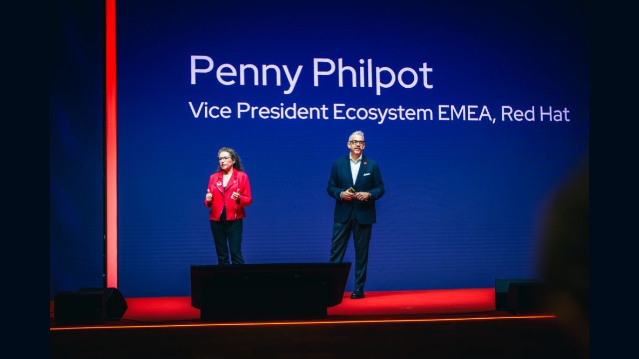 Sul palco Penny Philpot, Vice President Ecosystem EMEA, e Giampiero Cannavò, MED & Italy Ecosystem Director, raccontano il ruolo strategico giocato dai partner nei cammini di trasformazione e innovazione delle aziende clienti con Red Hat, affiancandosi sul palco al main partner dell’evento Intel e ai cloud provider AWS e Microsoft.
