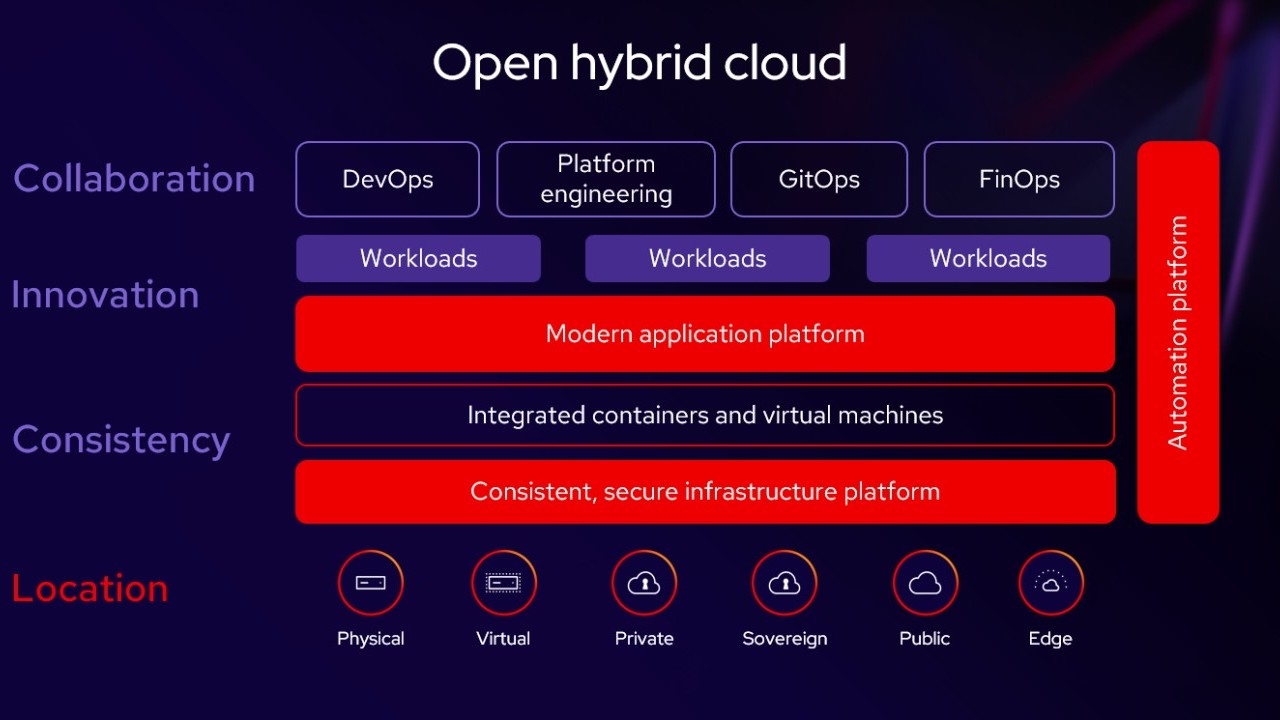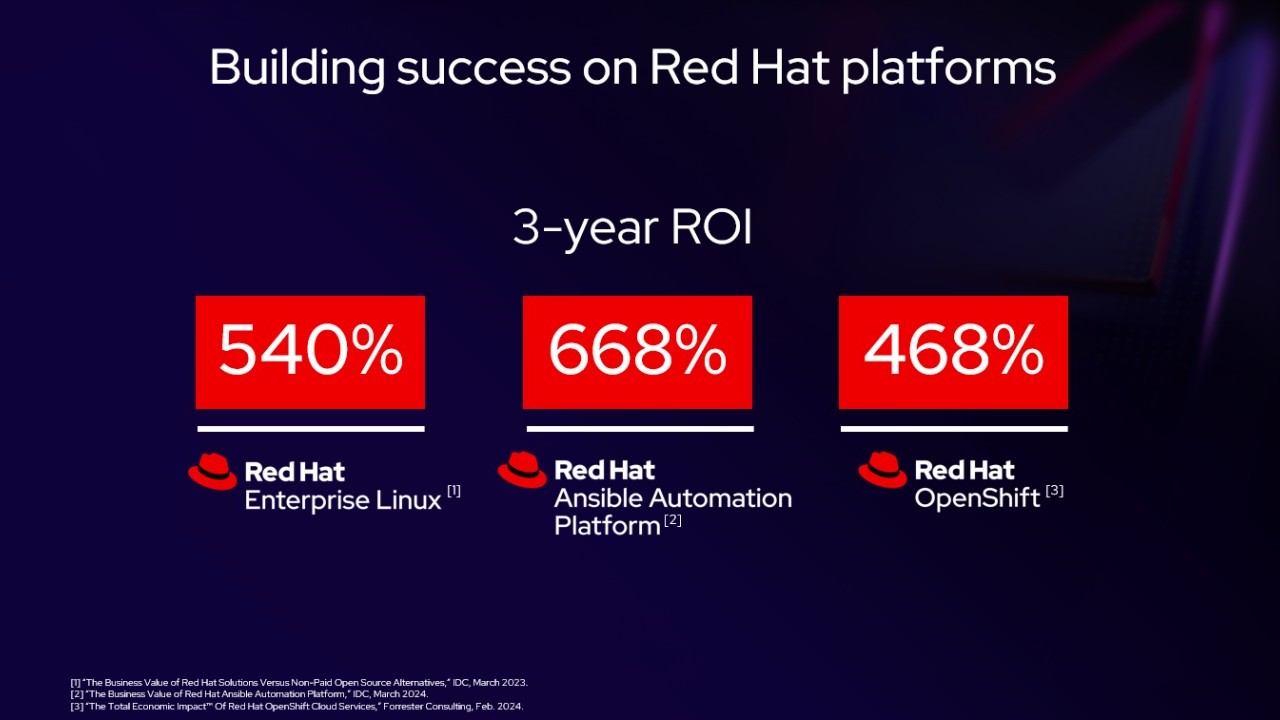 Il portafoglio Red Hat Open Hybrid Cloud abbraccia tutti questi elementi ereditati dall’era cloud: “Le piattaforme portanti di Red Hat - RHEL, Ansible e OpenShift – forniscono i servizi di cui la maggior parte delle persone fa uso quotidianamente, da quelli bancari all'assistenza sanitaria, dai trasporti alla telefonia mobile. Le aziende che scelgono di basarsi sulle piattaforme cloud ibride Red Hat stanno registrando un ROI triennale spaventoso. Si tratta di piattaforme riconosciute dalle principali società di analisi di mercato come leader nel settore cloud, container e automazione, che, indipendentemente dal luogo in cui vengono sviluppate ed eseguite in termini infrastrutturali e applicativi, si distinguono per ’coerenza’ e sicurezza.